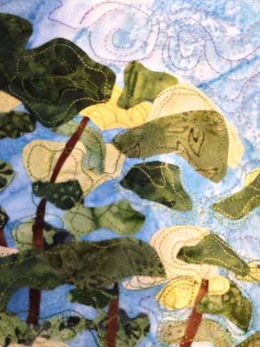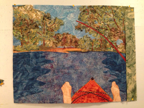 I finally put tule over cut up yarn and quilted away. Then I felt it was missing something so added a fishing pole. Ehhhh, it's ok but not great.